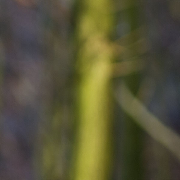 Anders sieht es mit Objekten im unscharf abgebildeten Vordergrund aus. Im linken Bildausschnitt unten zeigen sich an den Ästen deutliche Artefakte und Doppelkonturen, was nicht so schön ist. Dieses Abbildungsverhalten könnte einer sphärischen Unterkorrektion geschuldet sein, die durchaus beabsichtigt sein mag. Der etwas „nervöse“ Vordergrund wird so einem gleichmäßigeren Hintergrund geopfert. Da die Darstellung des Hintergrunds allgemein höher bewertet wird als die des Vordergrunds, ist eine solche Abstimmung durchaus plausibel, solange die allgemeine Bildwiedergabe nicht leidet. Fazit: Alles in allem gefällt mir das Bokeh des 45ers recht gut.
