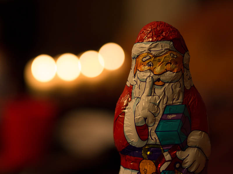 Wenn vom Bokeh die Rede ist, so denkt mancher zuerst oft an Spitzlichter, also helle Lichtquellen im Bildhintergrund, die möglichst "schön" wiedergegeben werden sollen. In dieser Disziplin kann das 45er durchaus punkten. Seht als Beispiel das nachfolgende Bild vom Schokoladenweihnachtsmann. Hier bei Blende f/1,8 werden die vier Lichter im Hintergrund als perfekt kreisrunde Lichtscheiben von sehr gleichmäßiger Helligkeit dargestellt. Die Ränder der vier Kreisscheiben sind nicht überbetont. Im Gegenteil, mir scheint, als wäre sogar ein leichter Hell-/Dunkelübergang im Randbereich zu erkennen. Auf jeden Fall zeigen diese Lichter im unscharfen Hintergrund keine hellen Ringstrukturen.